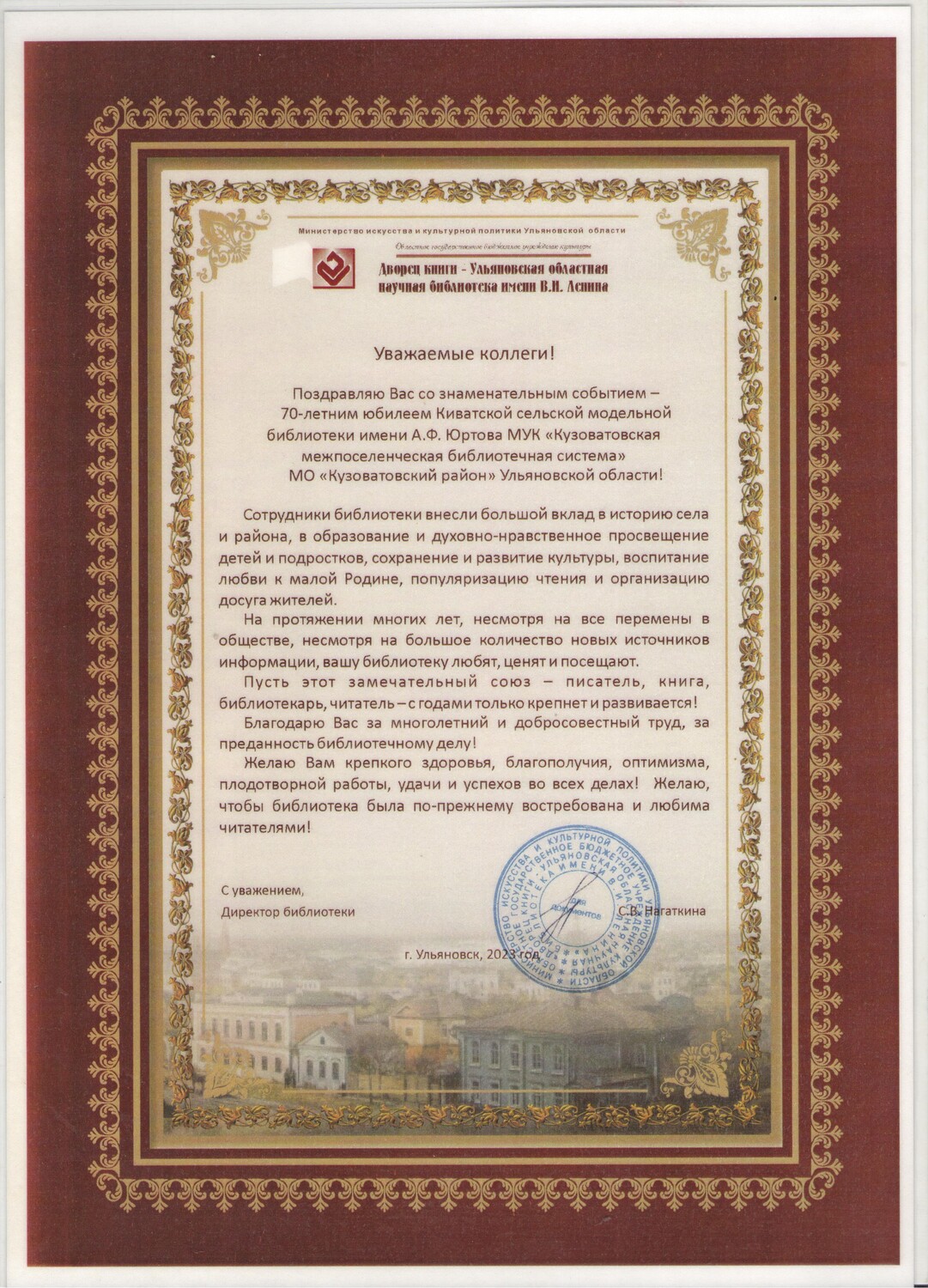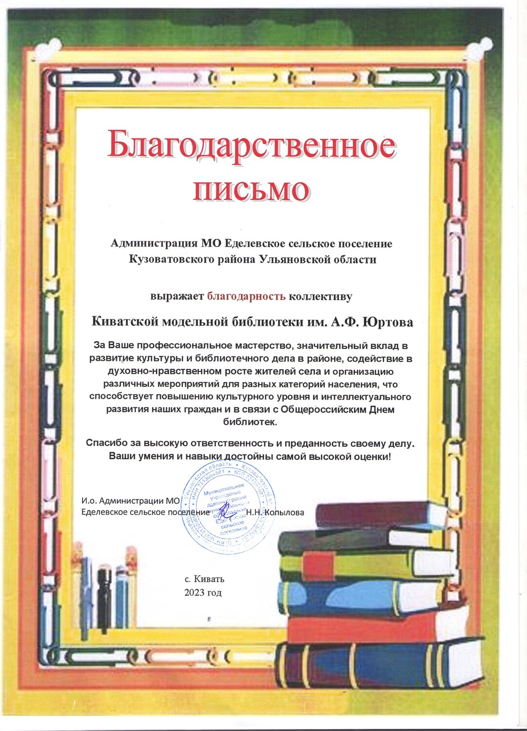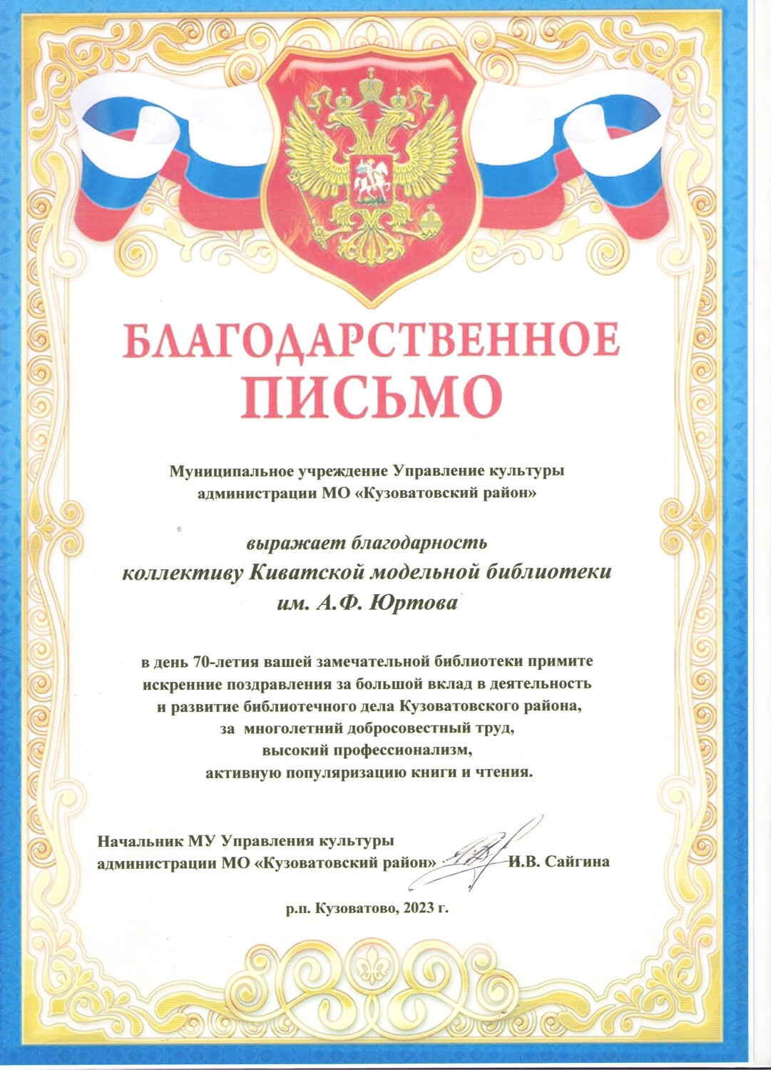 - Благодарственное письмо МУ Управления культуры администрации МО "КУзоватовский район" в день 70-летия библиотеки и за развитие библиотечного дела, активную популяризацию книги и чтения.