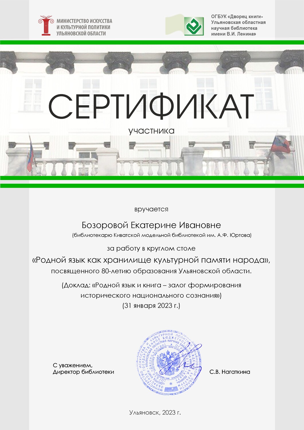 Сертификат участника Круглого стола «Родной язык как хранилище культурной памяти народа» с докладом «Родной язык и книга – залог формирования исторического национального сознания», г. Ульяновск.