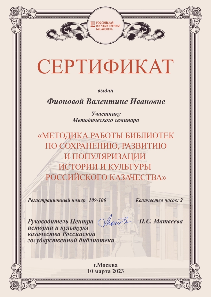 Сертификаты участников – Методического семинара «Методика работы библиотек по сохранению, развитию и популяризации истории и культуры российского казачества», Российская государственная библиотека, Центр истории и культуры казачества РГБ, г. Москва.