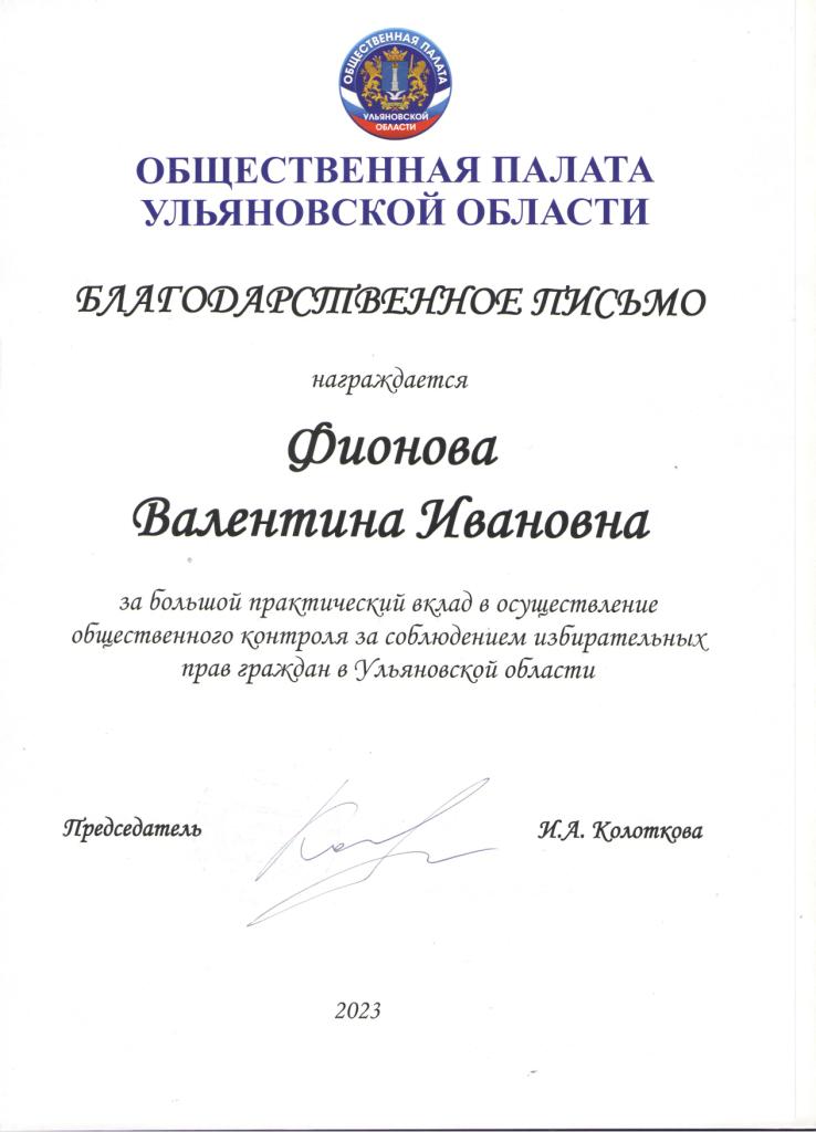 - Благодарственное письмо Общественной палаты Ульяновской области за большой практический вклад в осуществление общественного контроля за соблюдением избирательных прав граждан в Ульяновской области.