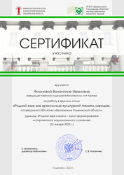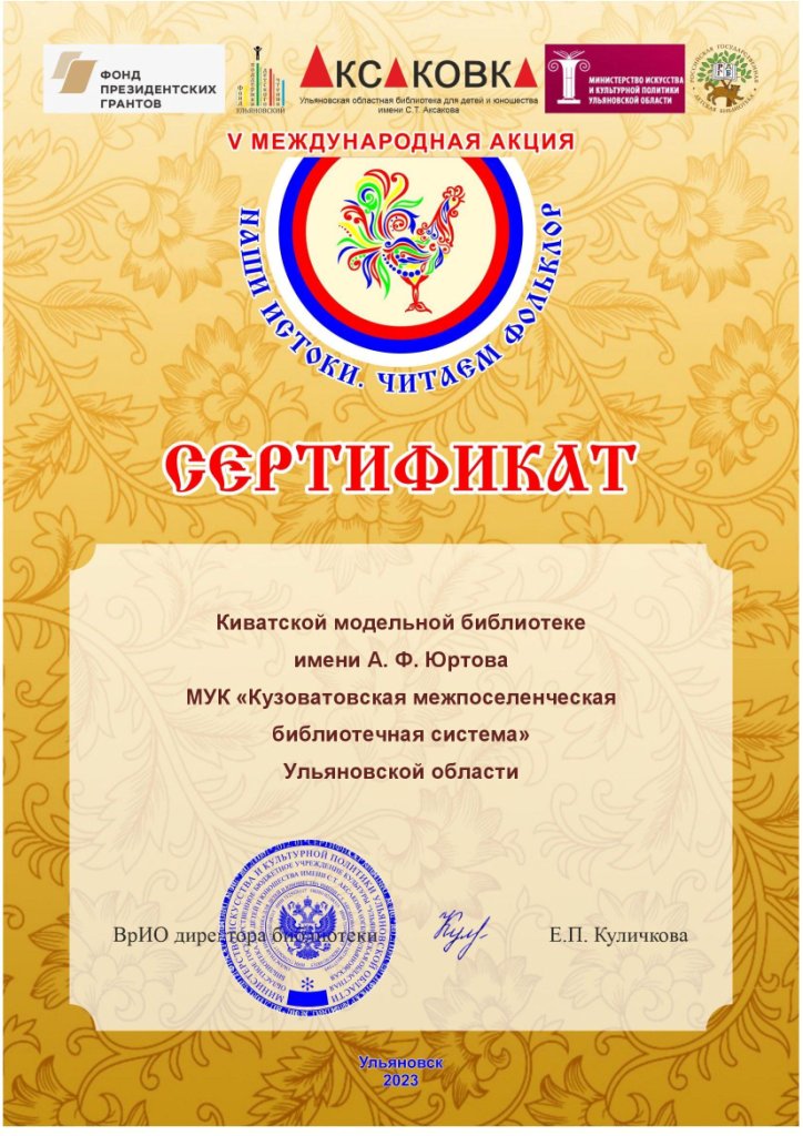 Сертификат участника V Международной акции «Наши истоки. Читаем фольклор» Министерства искусства и культурной политики Ульяновской области, ОГБУК «Ульяновская областная библиотека для детей и юношества имени С.Т. Аксакова» через Фонд президентских грантов.