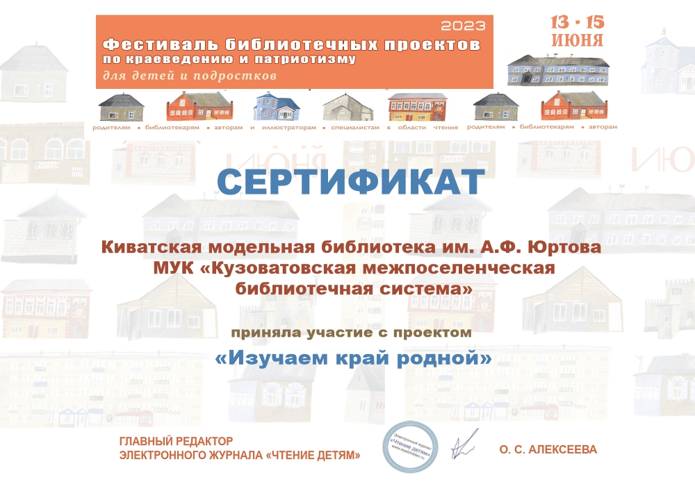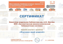 Сертификат участника Фестиваля библиотечных проектов по краеведению и патриотизму для детей и подростков с проектом «Изучаем край родной», Электронный журнал «Чтение детям», г. Москва.