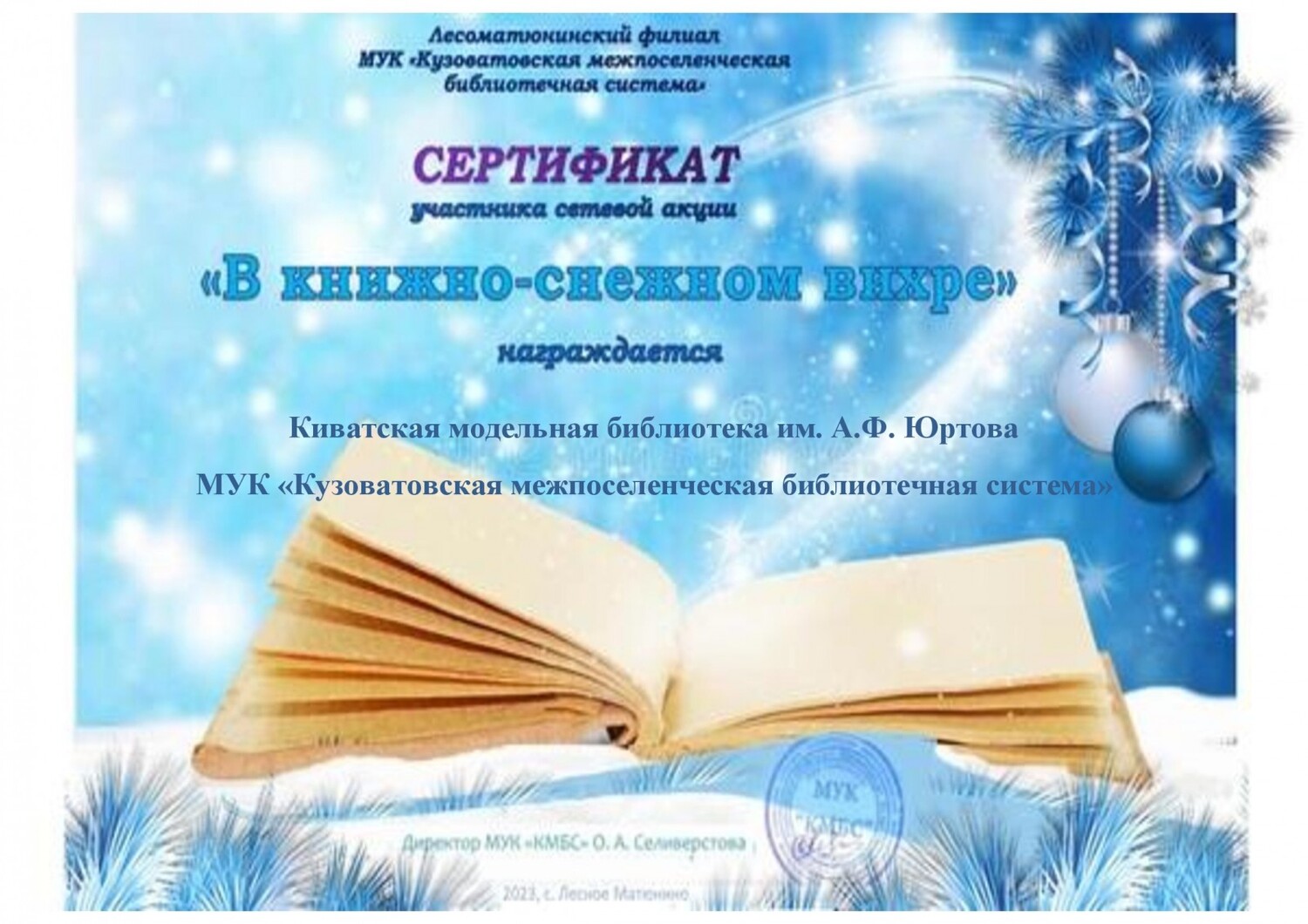 Сертификат участника сетевой акции «В книжно-снежном вихре», Лесоматюнинский филиал МУК «КМБС».