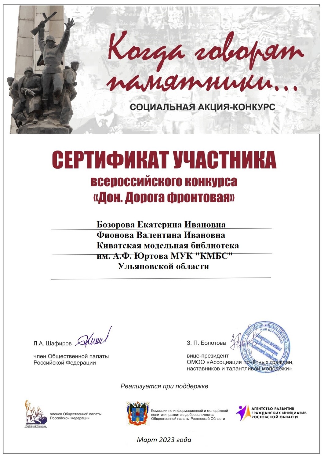 Сертификат участника Всероссийского конкурса «Дон. Дорога фронтовая» с работой «Наши деды - Ванькины», при поддержке Общественной палаты РФ, АРГИ Ростовской области.
