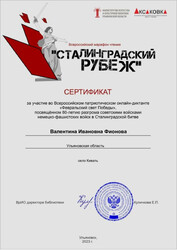 Сертификаты участников Всероссийского марафона чтения «Сталинградский рубеж», Всероссийского патриотического онлайн–диктанта «Февральский свет Победы», посвященного 80-летию разгрома советскими войсками немецко-фашистских войск в Сталинградской битве Министерства искусства и культурной политики Ульяновской области, ОГБУК «Ульяновская областная библиотека для детей и юношества имени С.Т. Аксакова».