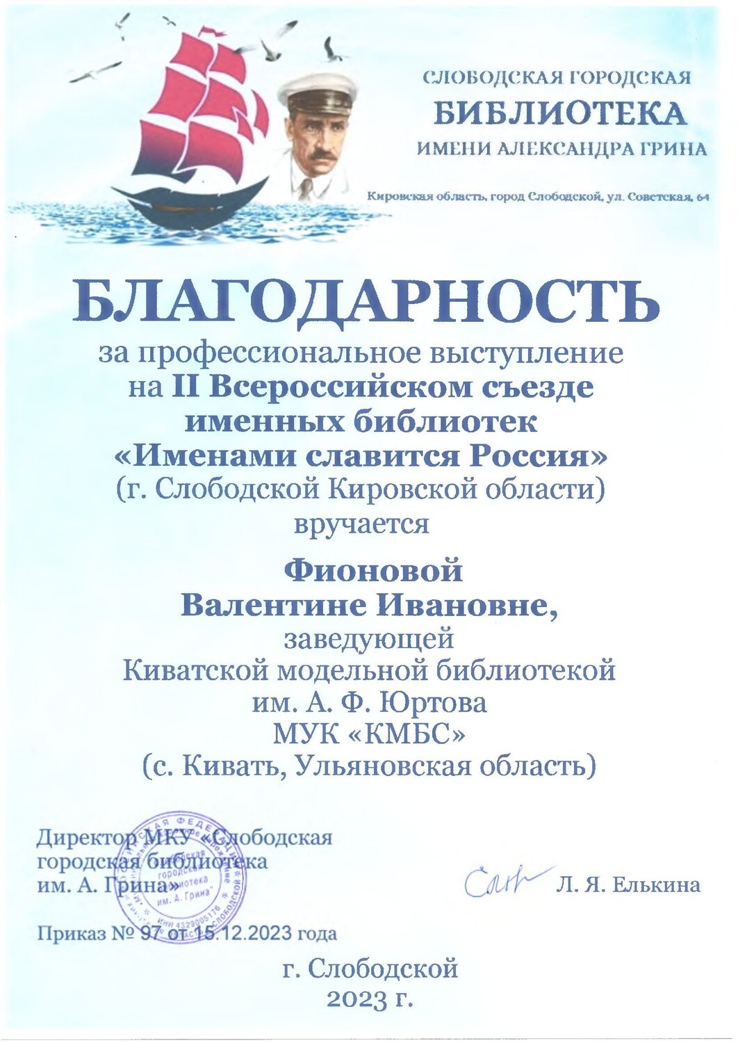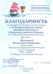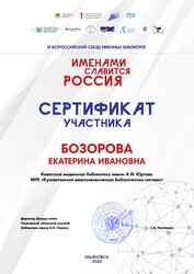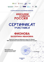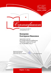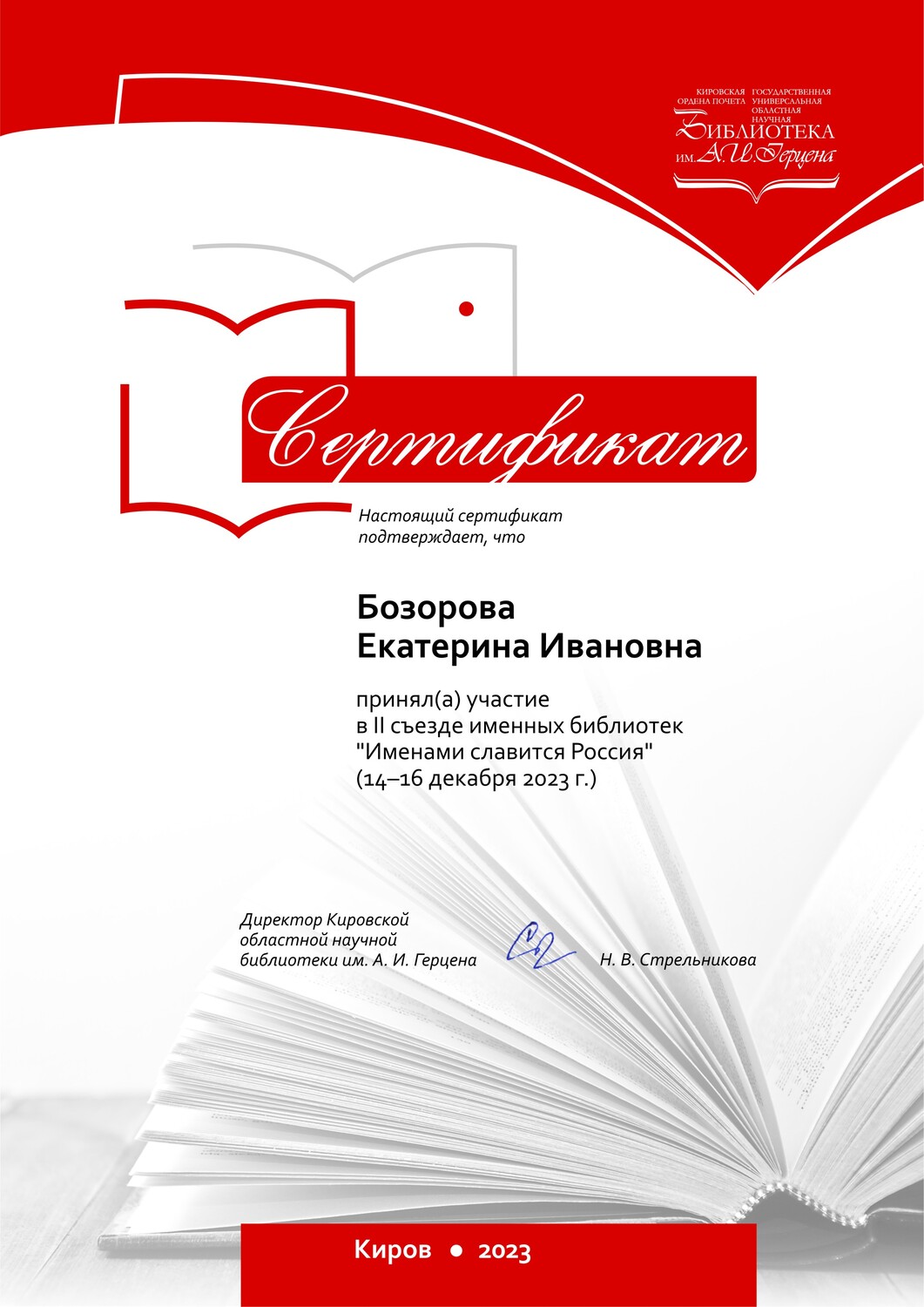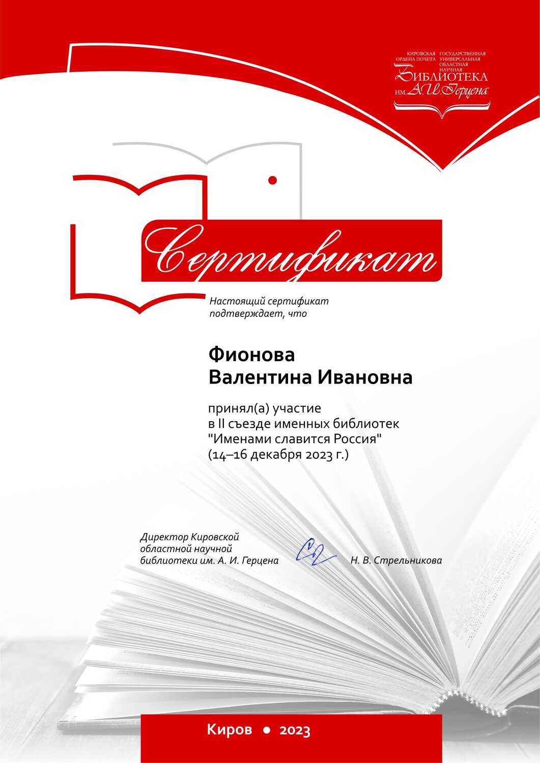 Сертификаты участников - II Всероссийского Съезда именных библиотек «Именами славится Россия» в Кировской государственной ордена Почета универсальной областной научной библиотеке им. А.И Герцена.