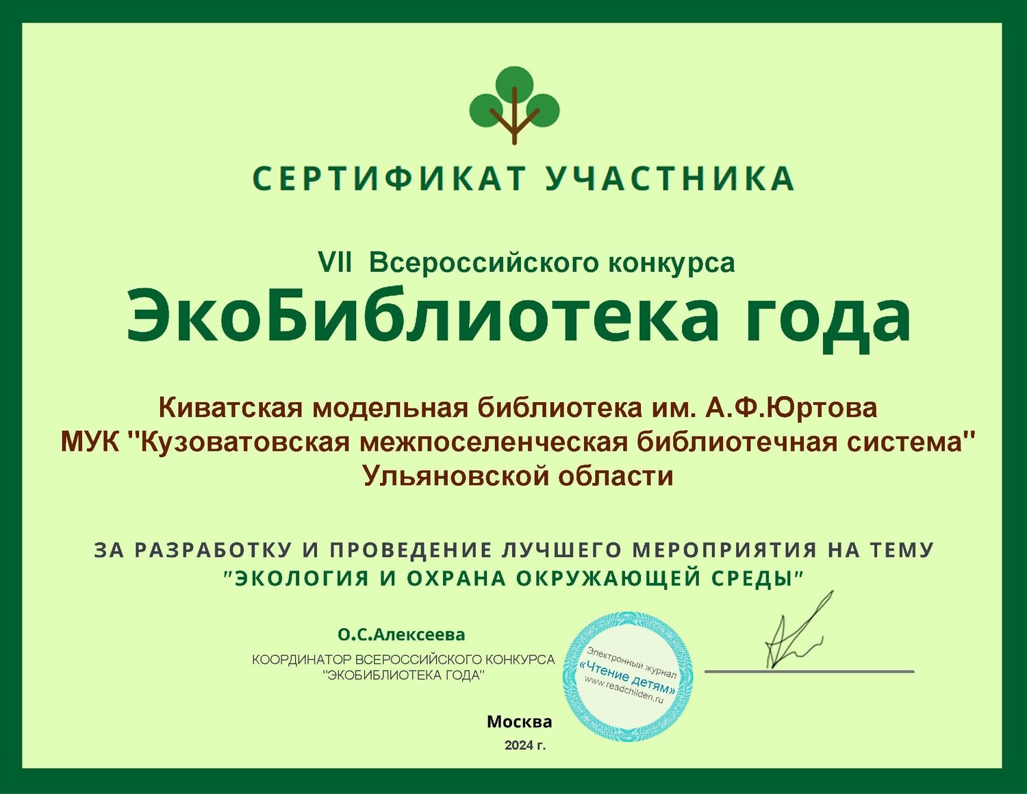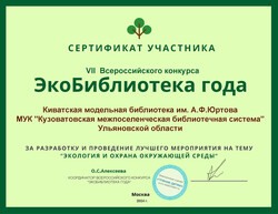 Сертификат участника VII Всероссийского конкурса «ЭкоБиблиотека года» за разработку и проведение лучшего мероприятия на тему «Экология и охрана окружающей среды», г. Москва.