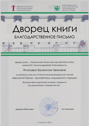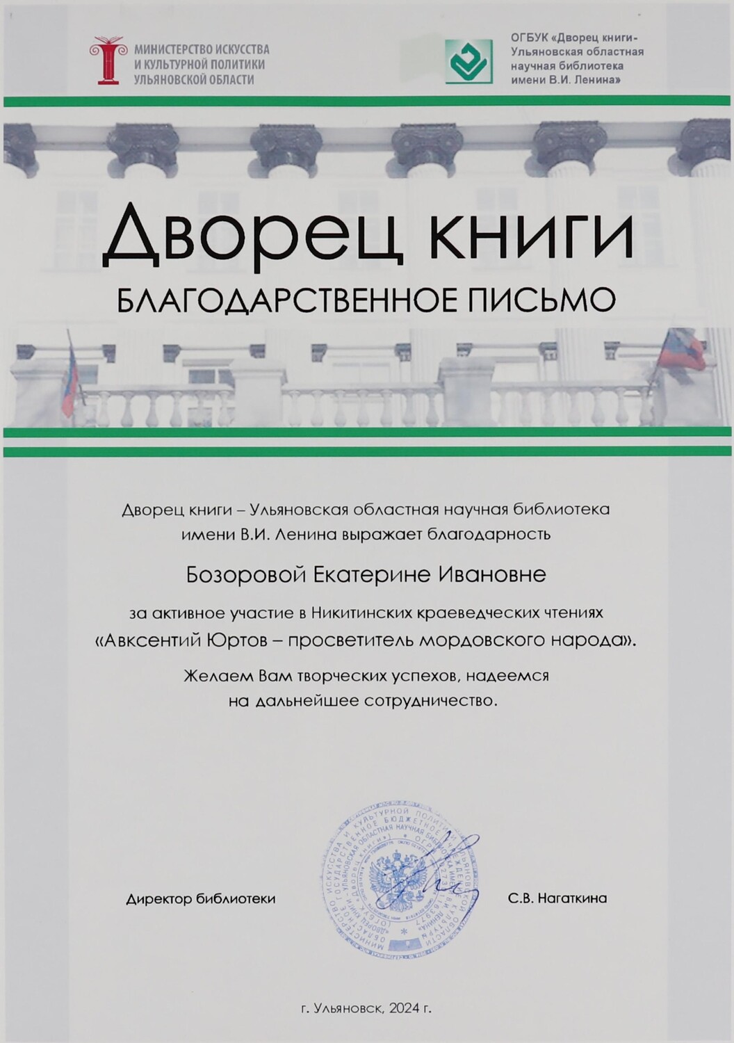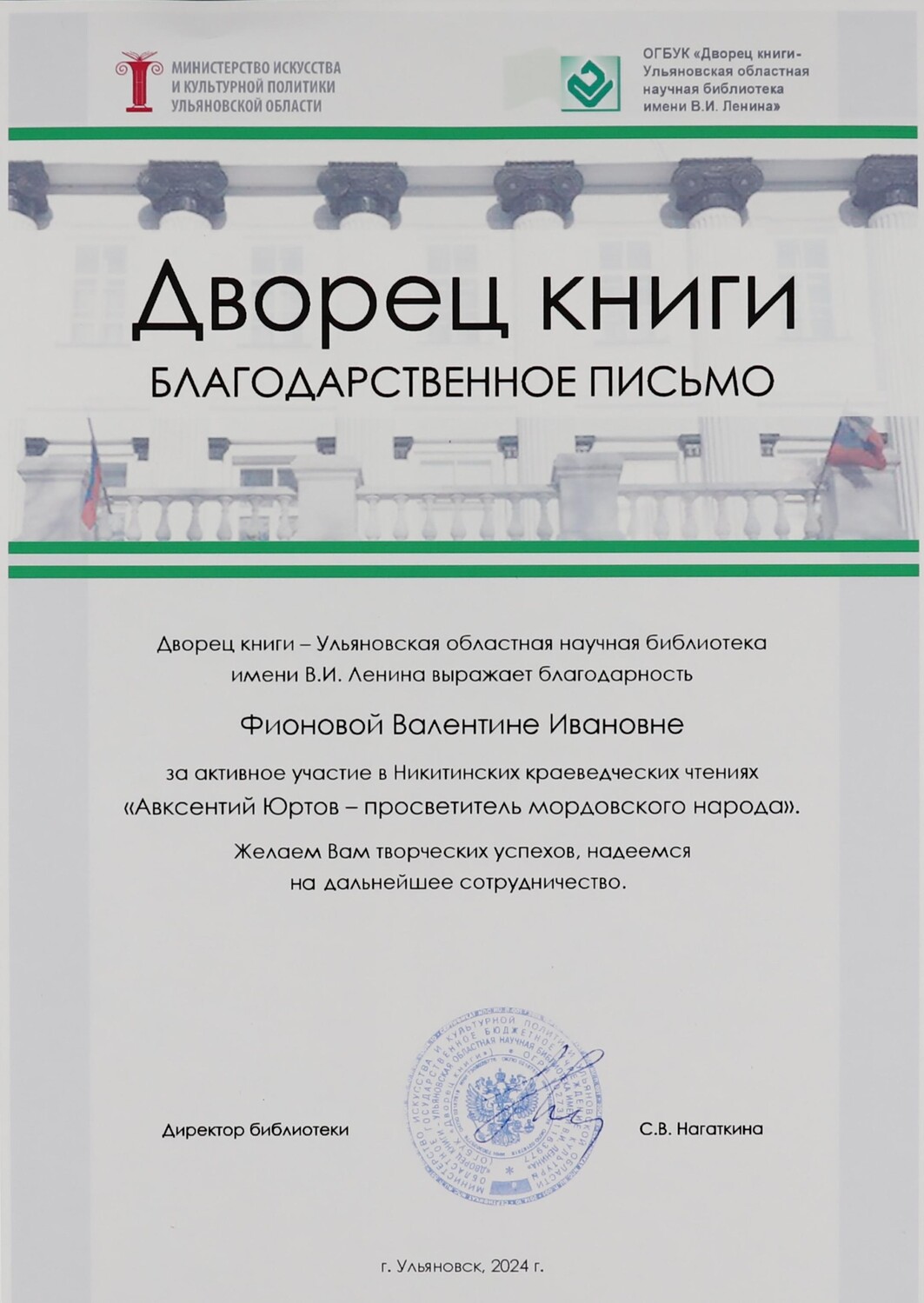 Благодарственное письмо Никитинских краеведческих чтений «Авксентий Юртов – просветитель мордовского народа» Дворца книги Ульяновской областной научной библиотеки имени В.И. Ленина.