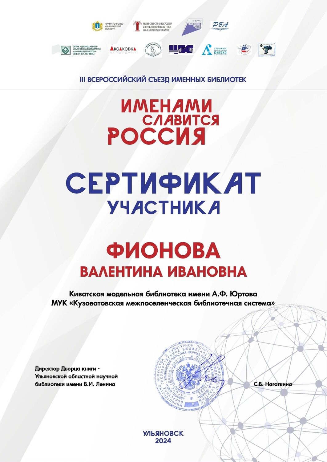 Сертификаты участников III Всероссийского Съезда именных библиотек, г. Ульяновск