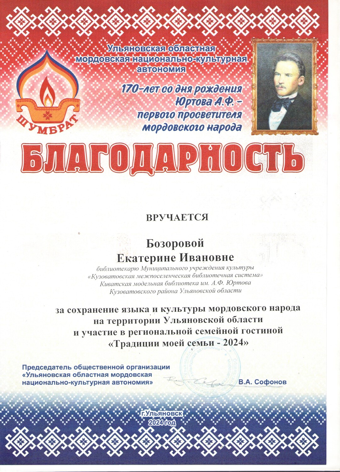 Благодарность Ульяновской областной мордовской национально-культурной автономии /170–лет со дня рождения Юртова А.Ф. – первого просветителя мордовского народа/ за сохранение языка и культуры мордовского народа на территории Ульяновской области и участие в региональной семейной гостиной «Традиции моей семьи – 2024».