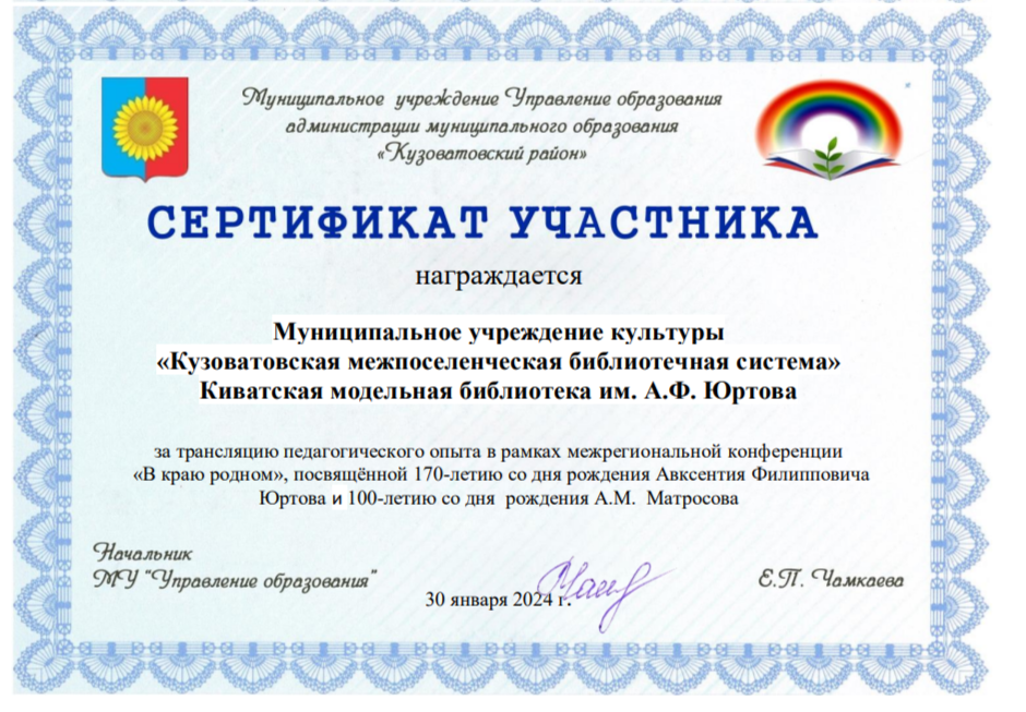 Сертификат участника Межрегиональной конференции «В краю моем история страны», посвященной 170-летию со дня рождения А.Ф. Юртова и 100-летию со дня рождения А.М. Матросова