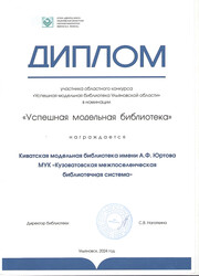 Диплом участника Областного профессионального конкурса «Успешная модельная библиотека Ульяновской области» в номинации «Успешная модельная библиотека».
