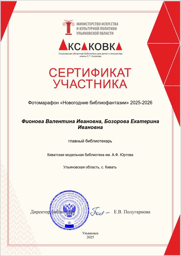 Сертификат участника фотомарафона "Новогодние библиофантазии" 2025-2026 ОГБУК «Ульяновской областной библиотеки для детей и юношества имени С.Т. Аксакова».