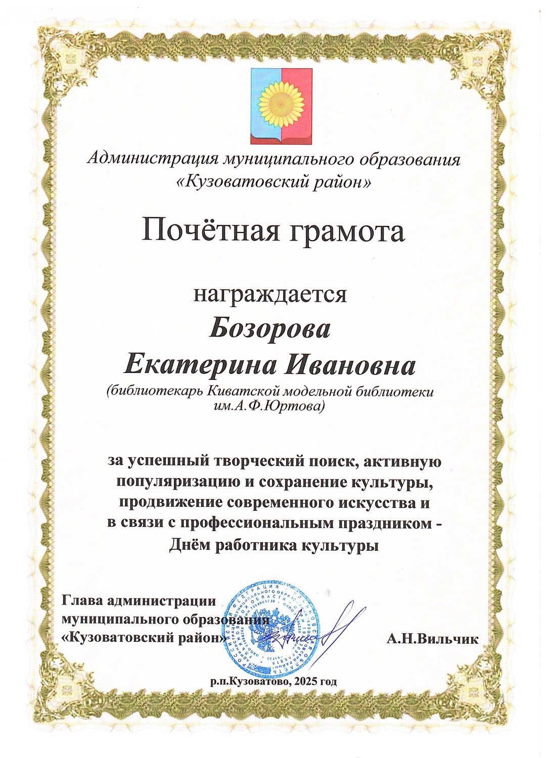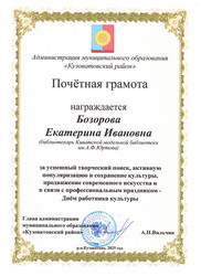 Почетная грамота Администрации МО «Кузоватовский район» за успешный творческий поиск, активную популяризацию и сохранение культуры, продвижение современного искусства и в связи с профессиональным праздником – Днем работника культуры.