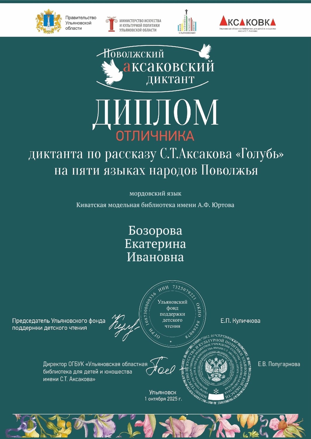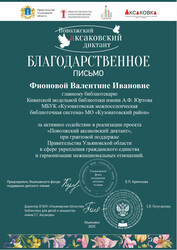 Благодарственное письмо организатора площадки и Диплом отличника Поволжского аксаковского диктанта ОГБУК «Ульяновская областная библиотека для детей и юношества имени С.Т. Аксакова.