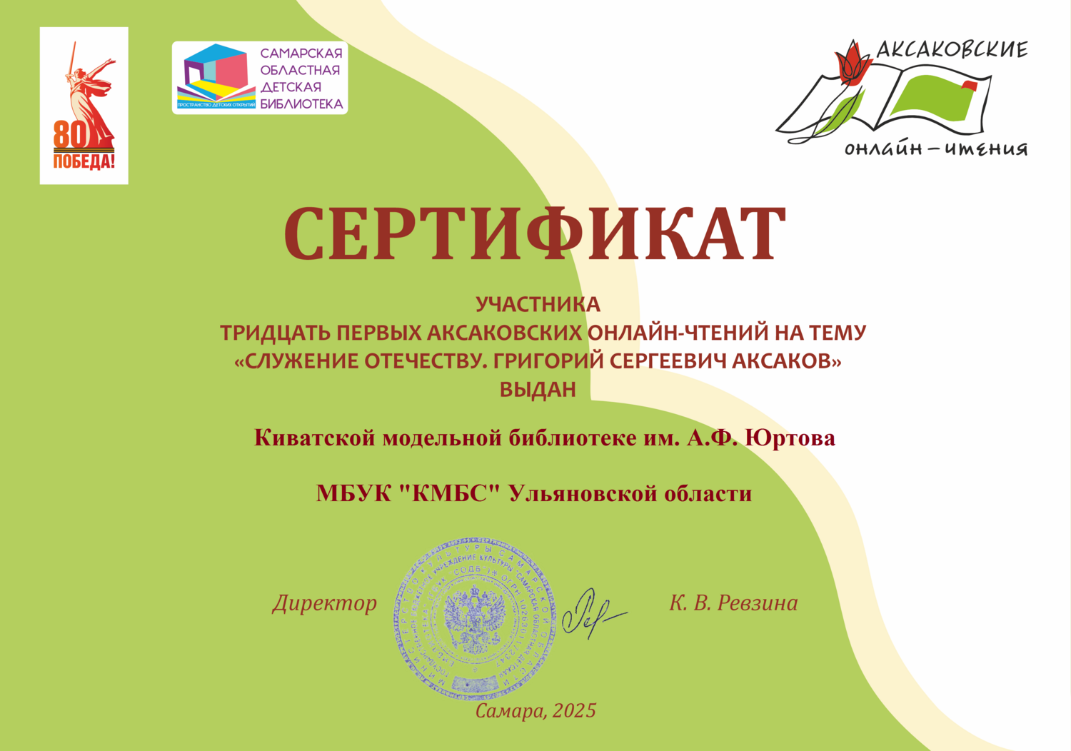 Сертификат участника Тридцать первых аксаковских онлайн-чтений на тему «Служение Отечеству. Григорий Сергеевич Аксаков» Самарской областной детской библиотеки.