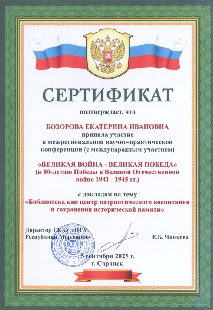 Сертификат участника Межрегиональной научно-практической конференции «Великая война – Великая Победа» (к 80-летию Победы в Великой Отечественной войне 1941 – 1945 гг.) - Национальная библиотека имени А.С. Пушкина Республики Мордовия.