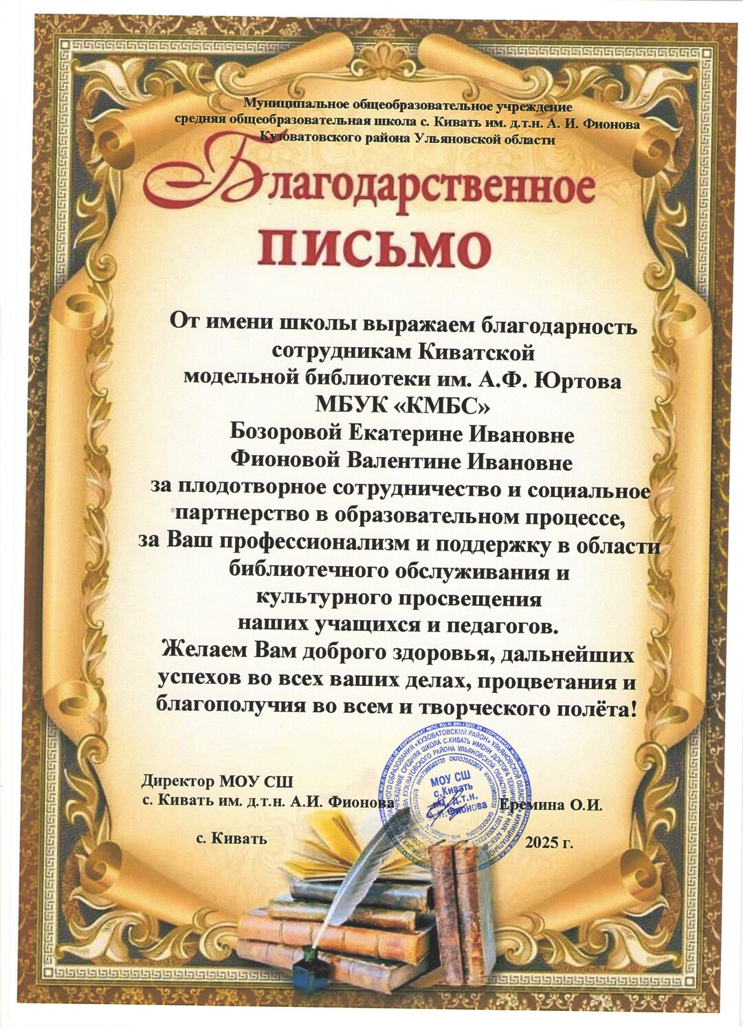 Благодарственное письмо от МОУ СШ с. Кивать им. д.т.н. А.И. Фионова за плодотворное сотрудничество и социальное партнерство в образовательном процессе.