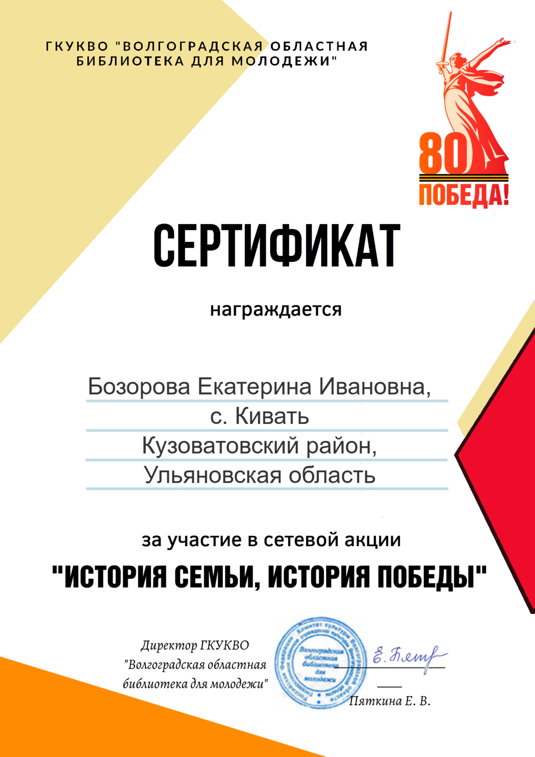 Сертификаты участников сетевой акции «История семьи, история Победы» ГКУКВО «Волгоградской областной библиотеки для молодежи».