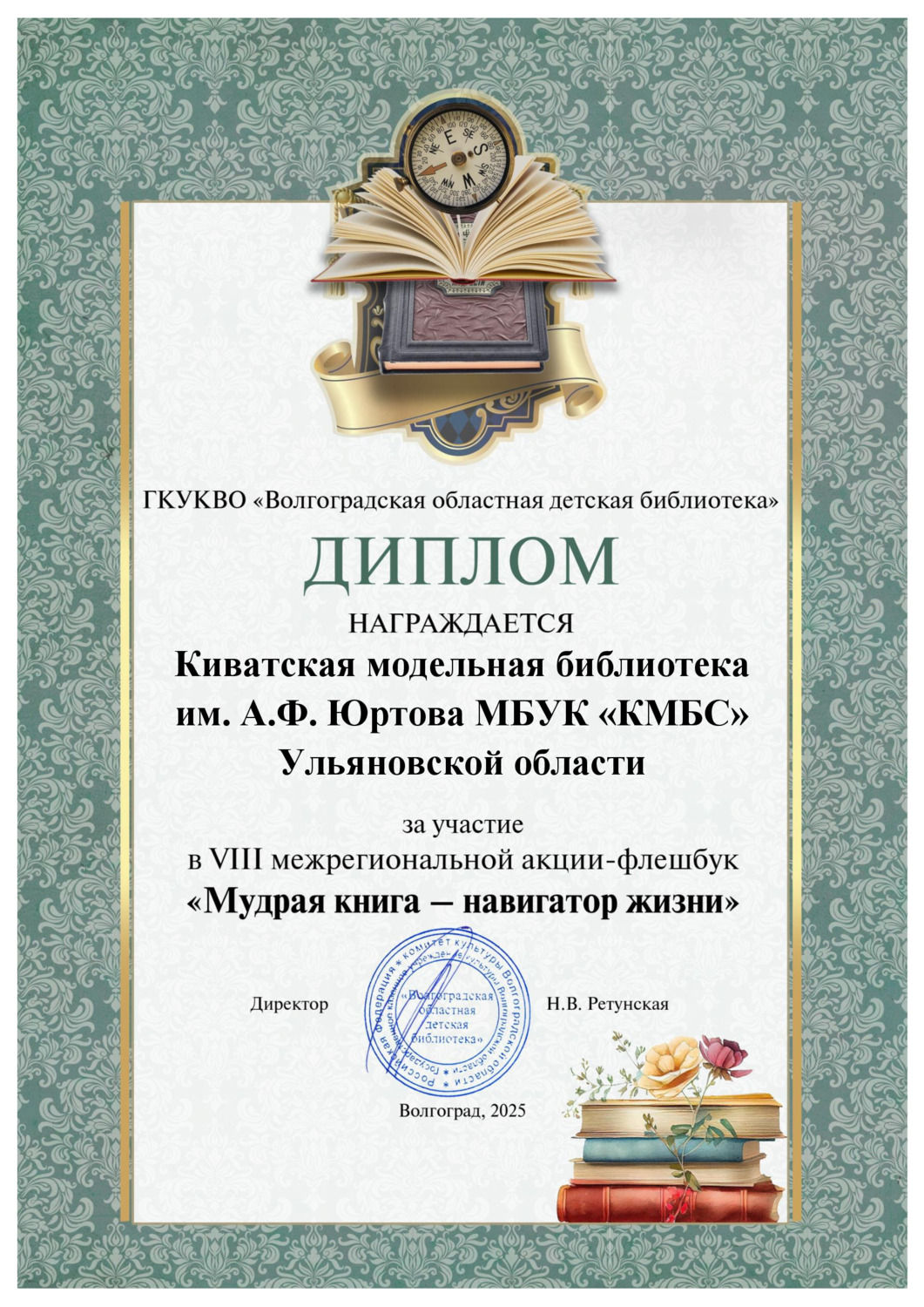 Сертификат участника VIII межрегиональной акции-флешбук «Мудрая книга – навигатор жизни", ГКУКВО «Волгоградской областной детской библиотеки».