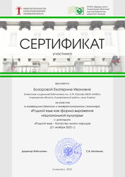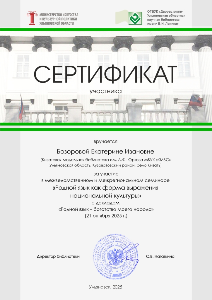 Сертификаты участников Межведомственного межрегионального семинара «Родной язык как форма выражения национальной культуры» УОНБ им. В.И. Ленина, Дворец книги, г. Ульяновск.