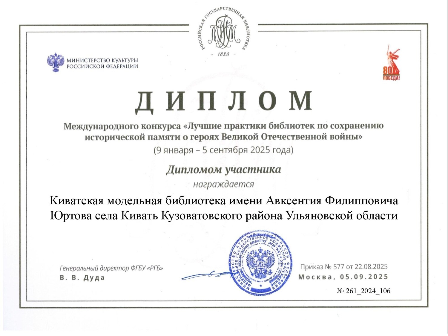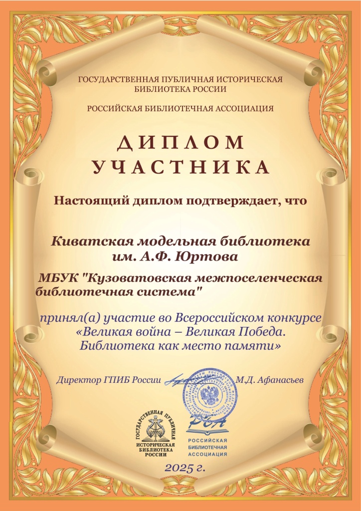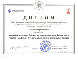 Диплом участника Международного конкурса «Лучшие практики библиотек по сохранению исторической памяти о героях Великой Отечественной войны», МК РФ РГБ, г. Москва.