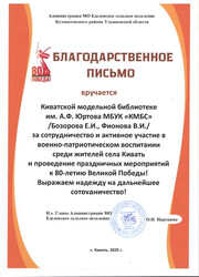 Благодарственное письмо Администрации МО Еделевское сельское поселение Кузоватовского района за сотрудничество и активное участие в военно-патриотическом воспитании среди жителей села Кивать и проведение праздничных мероприятий к 80-летию Великой Победы!